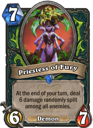 Priestess of Fury is another ridiculously powerful Demon Hunter card that can wipe an opponent's board each turn. If you happen to play two copies of Priestess of Fury, nothing can stop you — unless your opponent has targeted spell removal.