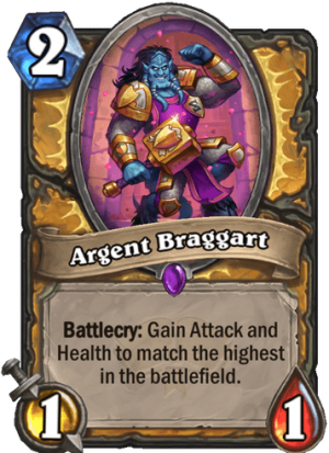 The text on this card may be a bit unclear at first, but it really is as broken as it sounds. Argent Braggart really does "gain Attack and Health to match the highest [card] on the battlefield."