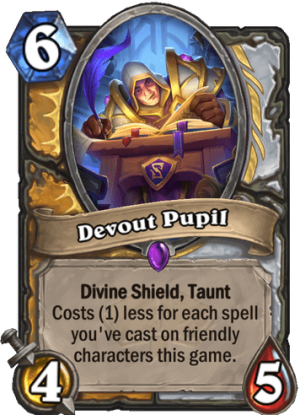 You can quickly buff your cheaper minions and put Devout Pupil on board as early as turn three, and that's really strong for a 4/5 minion with Divine Shield and Taunt. Without doubt, the second copy will be played for free.