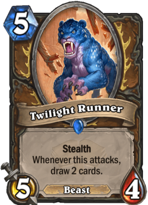 Twilight Runner can be utilized with Guardian Animals spell, which are able to put it on board, allowing players to draw two cards immediately with its Rush mechanic.