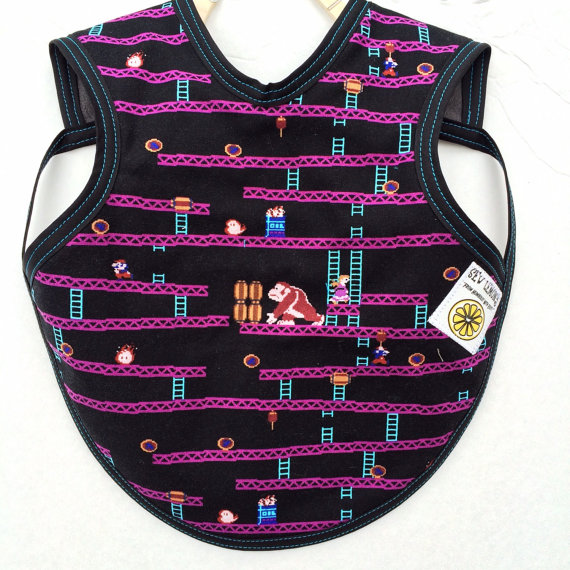 Remember the good ole days of Atari? Your kids probably don’t, so why not bring up some old memories with this? This handmade Donkey Kong bib fits 4 months to 2-year-olds and will definitely remind the classic gamer of this retro thrill. It is designed to be placed over the head like a shirt, and it’s fitted with arm holes in order to keep it steady to catch those impending food drips.
