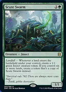Scute Swarm is similar to Scute Mob, and it can be a very dangerous card in any list focused on lands. It creates a copy token if you control six or more lands.