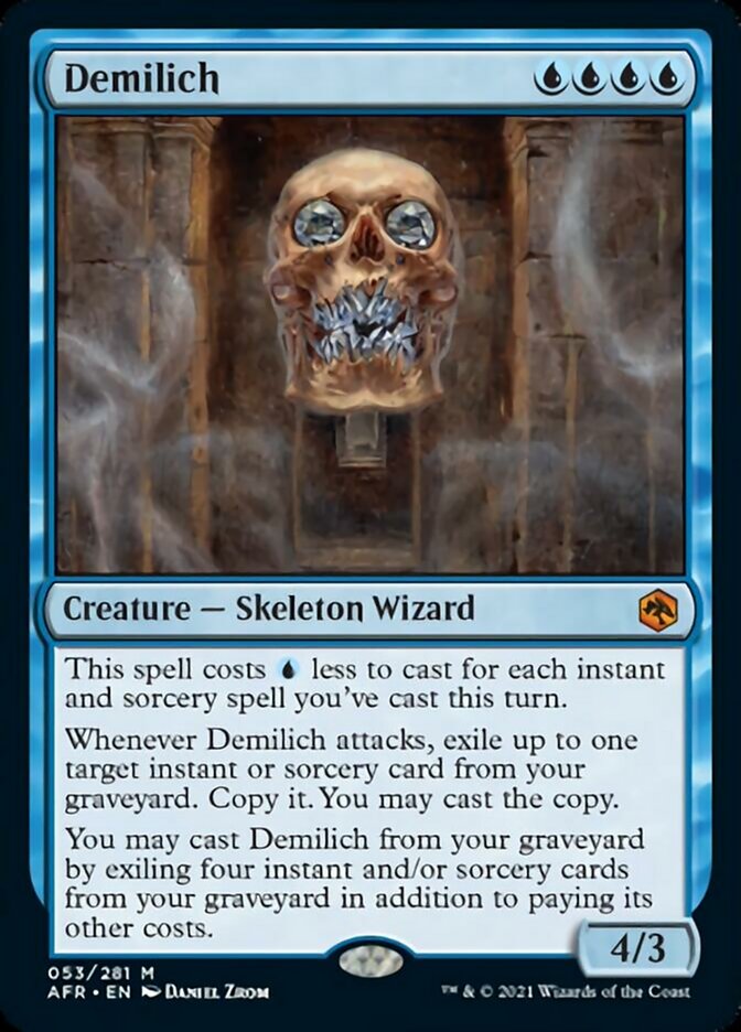 The second ability on Demilich echoes the infamous Snapcaster Mage and Dreadhorde Arcanist. Additionally, if it gets countered after casting four spells in a row, you can immediately recast it from your graveyard.