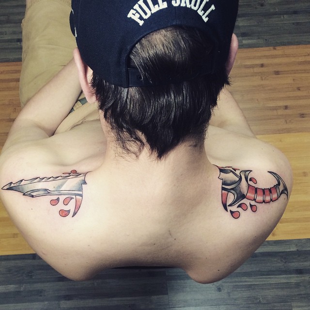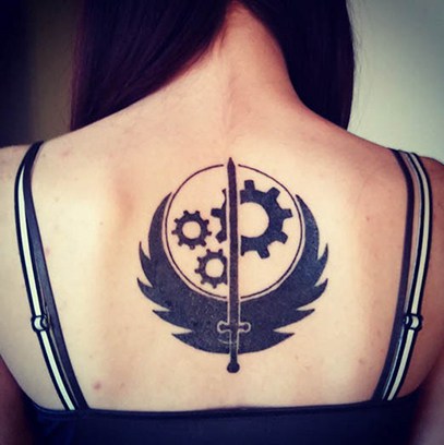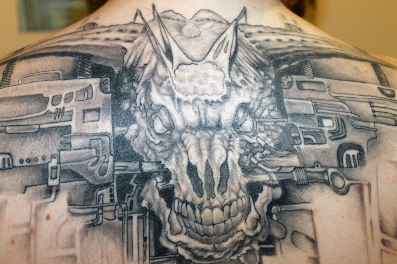 This piece covers the entire back shoulders of one lucky fan, who has a monster from the franchise surrounded by machinery in a black-and-gray tattoo.