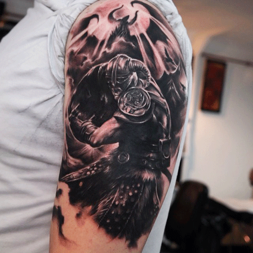 Of course, anyone considering getting an Elder Scrolls tattoo may immediately think of the Dragonborn, as he is the most recognizable character in the entire franchise at this point. Some may think it would get boring, but when done right — like it is in this tattoo to the left — that really does not matter.