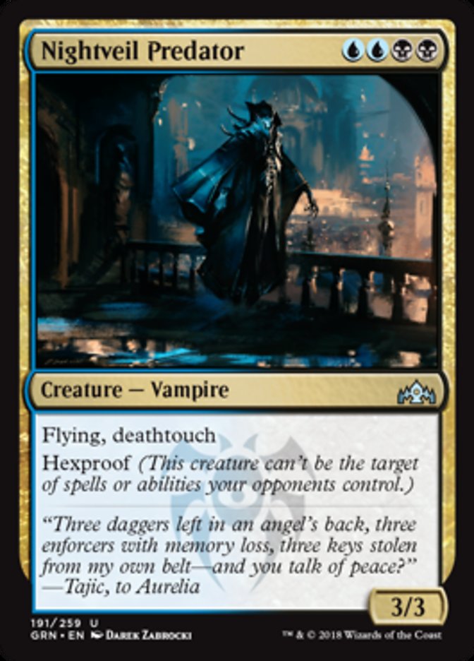 Although there is nothing new in terms of abilities on Nightveil Predator, it is the first creature in the Magic's roster that has Flying, Deathtouch and Hexproof slammed on one card.