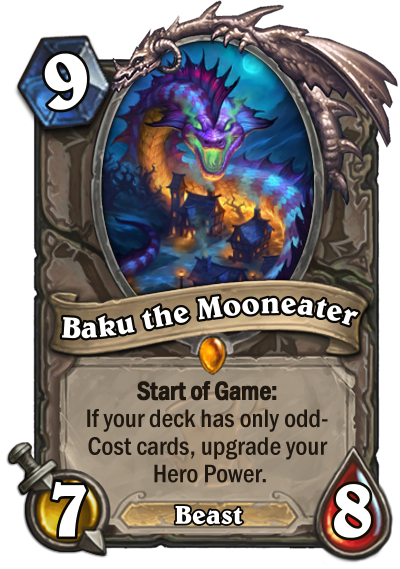 Here is a card that will define and dominate all odd-cost decks in this meta. Baku is a legendary that upgrades your hero power in the same way Justicar Trueheart had done before.