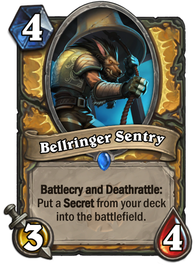Here is a fairer version of Mysterious Challenger -- a card that can only be seen in Wild format now. Bellringer Sentry puts two random secrets on the board, which is totally enough for current Aggro Paladin decks that use only a few really effective secrets.