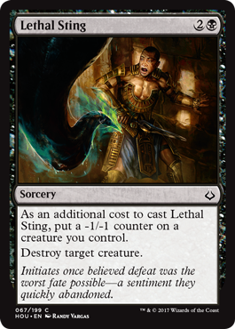The extra cost on Lethal Sting is not a big deal either, as -1/-1 counters are easy to deal with -- especially if you have creatures like Quarry Hauler or Vizier of Remedies that can easily negate the effect.