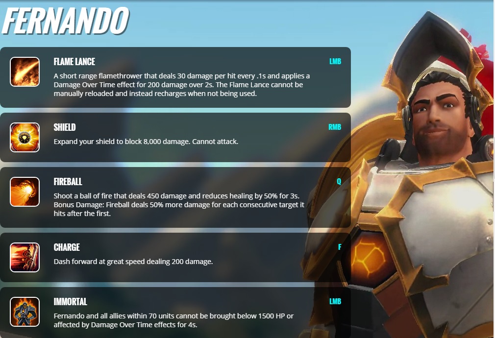Fernando is a front liner champion, which makes him good at holding the line and protecting teammates. Front Line champions gain 100% more Credits for standing near an objective. Your job as Fernando will be a pretty standard tank role — trying to protect your teammates so they can rain hell down on the other team.