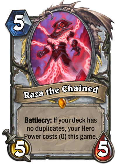 Raza the Chained is one of three class cards coming in Mean Streets of Gadgetzan which use the "no duplicates" deck idea introduced by Reno Jackson in the League of Explorers. With a 5/5 body and a 5 cost, Raza has an average body. However, its Battlecry reduces the cost of your hero power to 0, meaning you will be able to heal yourself or a minion for two health each turn regardless of what else you play that turn. If played exactly on turn five, this means that you will get a lot of value out of Raza.