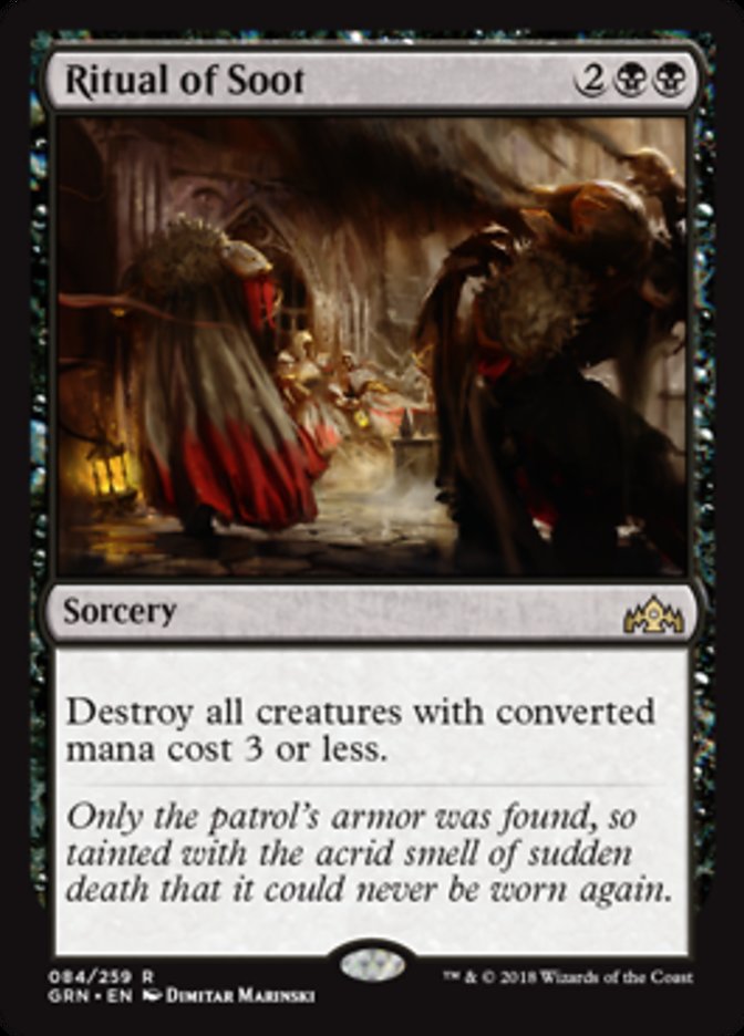 There are some fantastic AoE removal spells in the Modern format (e.g. Damnation). But the problem with these types of spells is that they remove all creatures. On the other hand, Ritual of Soot can become a very fine tool in the right deck that will leave your own creatures untouched.