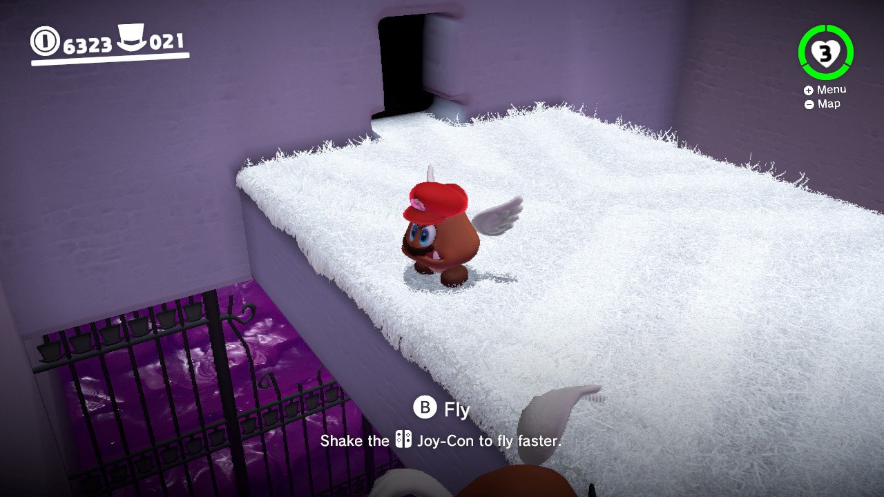 In a stage on the back of Top Hat Tower, you must capture a ParaGoomba and fly across waves of poison, grabbing Moon pieces on the way, to reach the exit. However, flying under the farthest platform and through the broken fence will lead you to a second Moon, hidden behind a high wall!