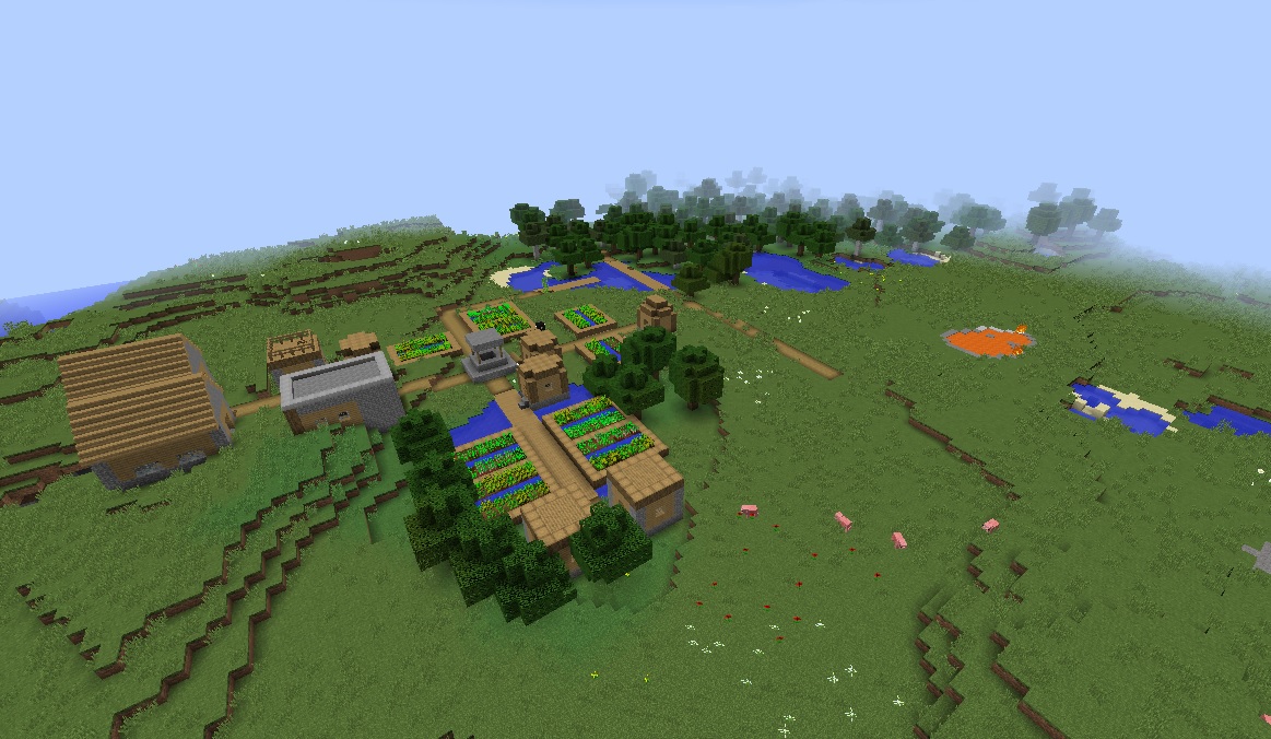 Double village at spawn! You will spot the first one right away, but the other one is just beyond the hills at coordinates -152 200. The second one has lots and lots of horses and sheep hanging around, although neither of the settlements has blacksmiths.