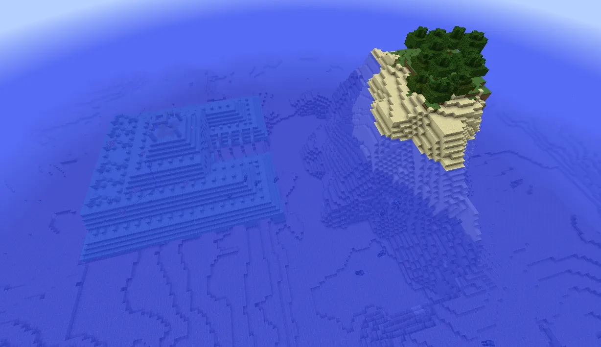 Here, you'll spawn on the beach of a diminutive survival island that has more trees than many other bigger isles located in the same area. But this one is special since it's got a whole ocean monument right beneath it.
