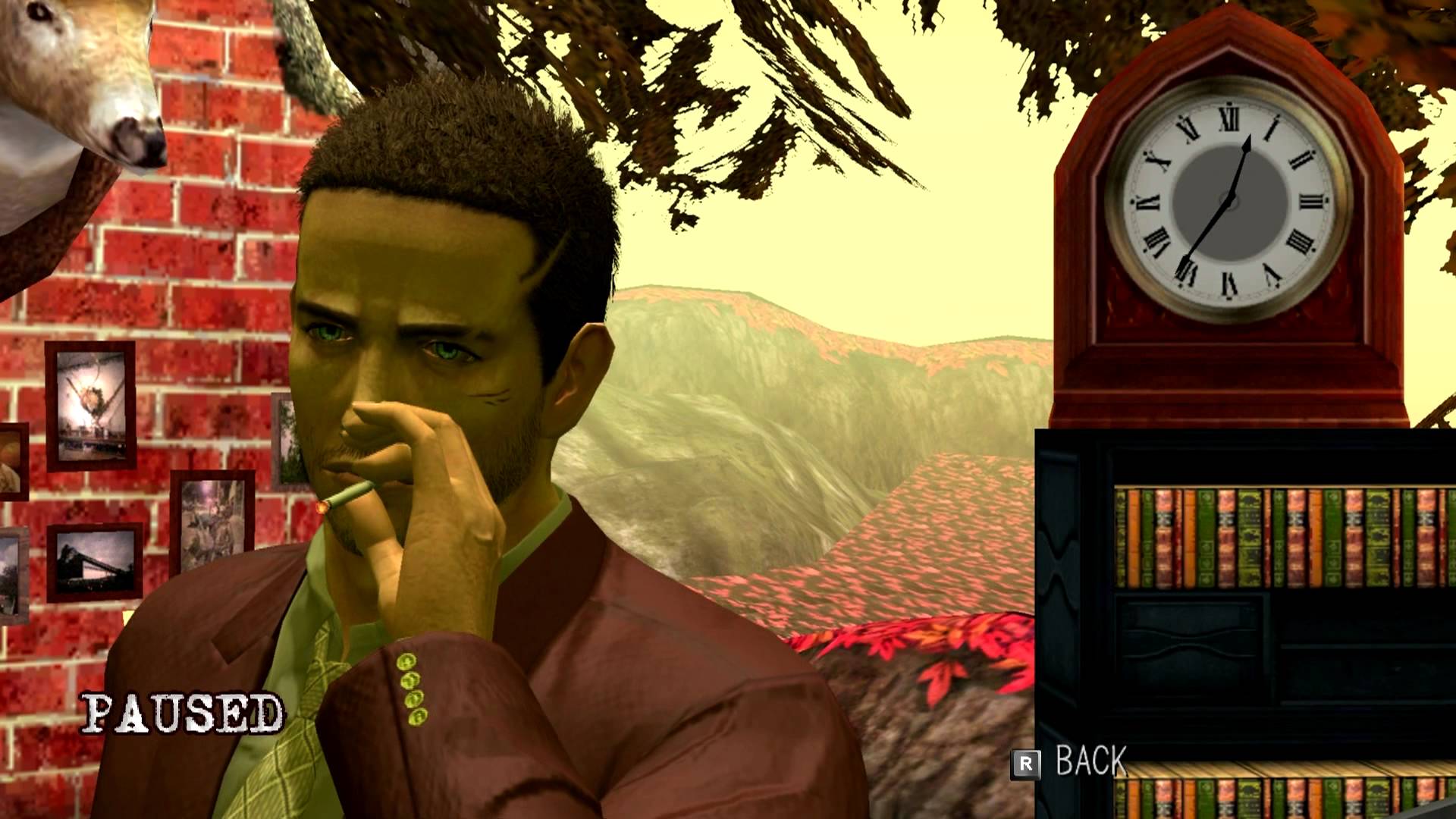 In terms of gameplay, Deadly Premonition runs on a timed schedule, where certain places (such as a store) only opens at certain intervals, so there’s a need to speed up the day to complete key events. How does York fast-forward time you ask? Via a cigarette and his own little mind-world of home furnishings and red leafed vistas, of course: