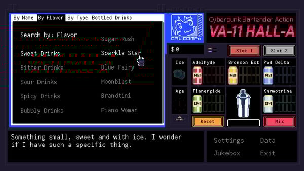 VA-11 Hall-A: Cyberpunk Bartender Action‘s title speaks for itself — set in a post-dystopia world, you play the day-to-day as a bartender named Jill, mixing drinks and chatting with the various customers in beautiful pixel format.