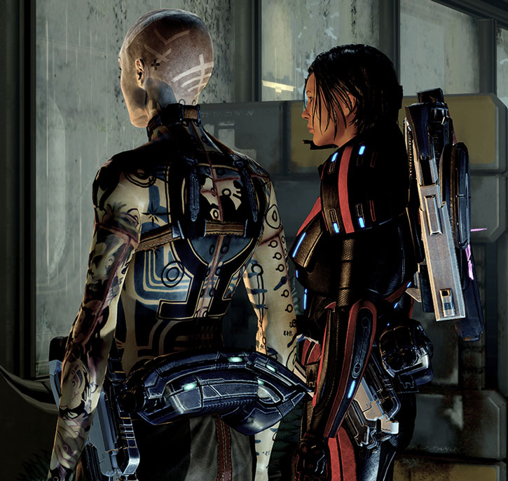 Her need and potentially developing feelings for Shepard helps Tali grow into a far more confident and interesting character. As her confidence increases she begins to show a good level of humor, sarcasm and a more assertive side in contrast to the shy and reserved character she started out as. Depending on romance options, this new personality was shown in verbal back and forths with Ashley or Miranda during missions. Tali needed Shephard's positive influence to become stronger and more independant.