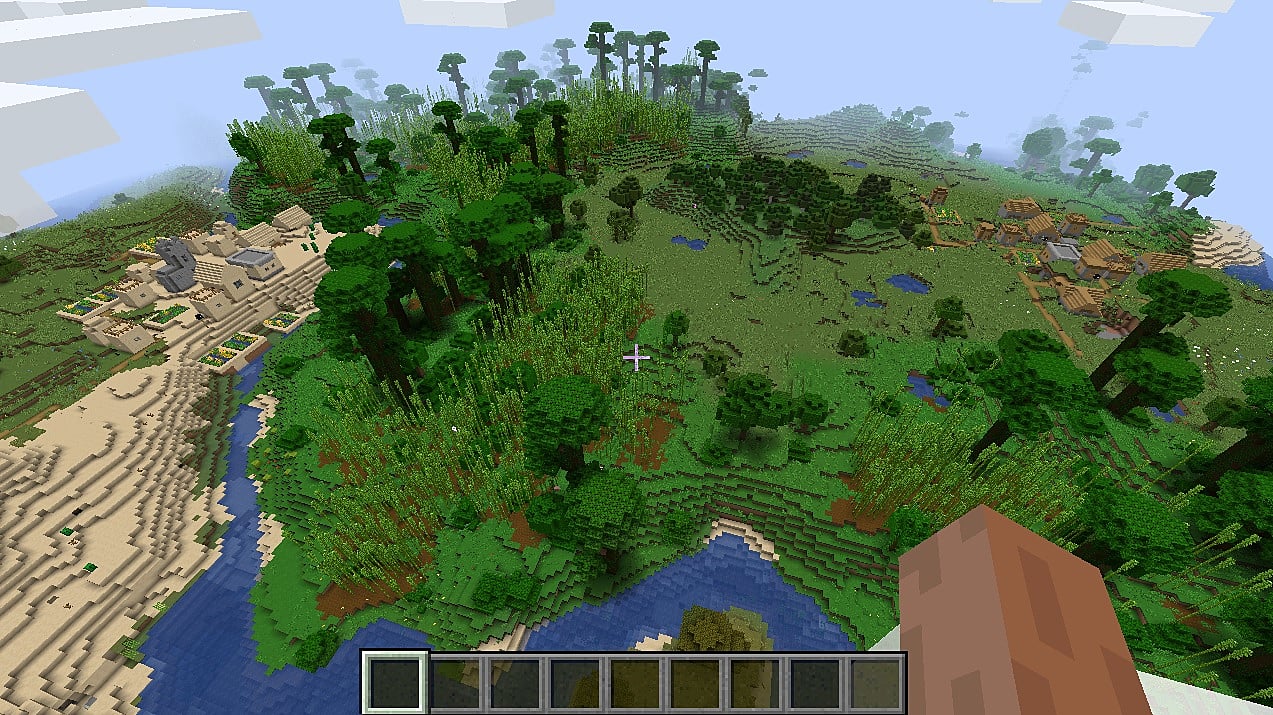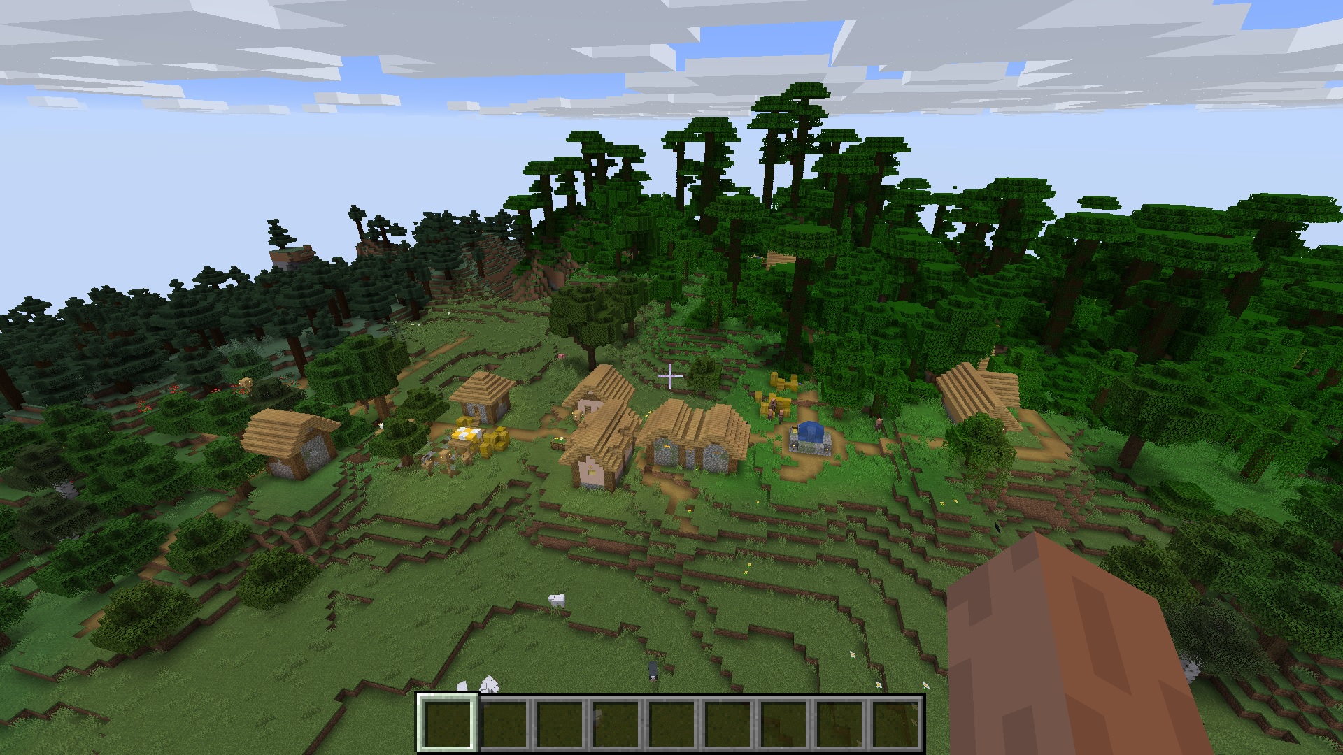 In this seed, you'll spawn in the center of a small village that stands on the triple frontier of jungle, forest, and plains.