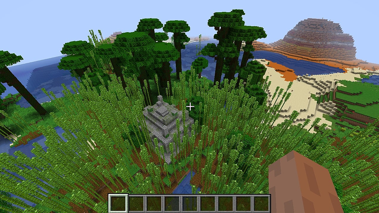 Here, you will spawn at the intersection of bamboo jungle, desert, and mesa biomes, complete with a jungle pyramid. Inside the temple, you will find the following loot: