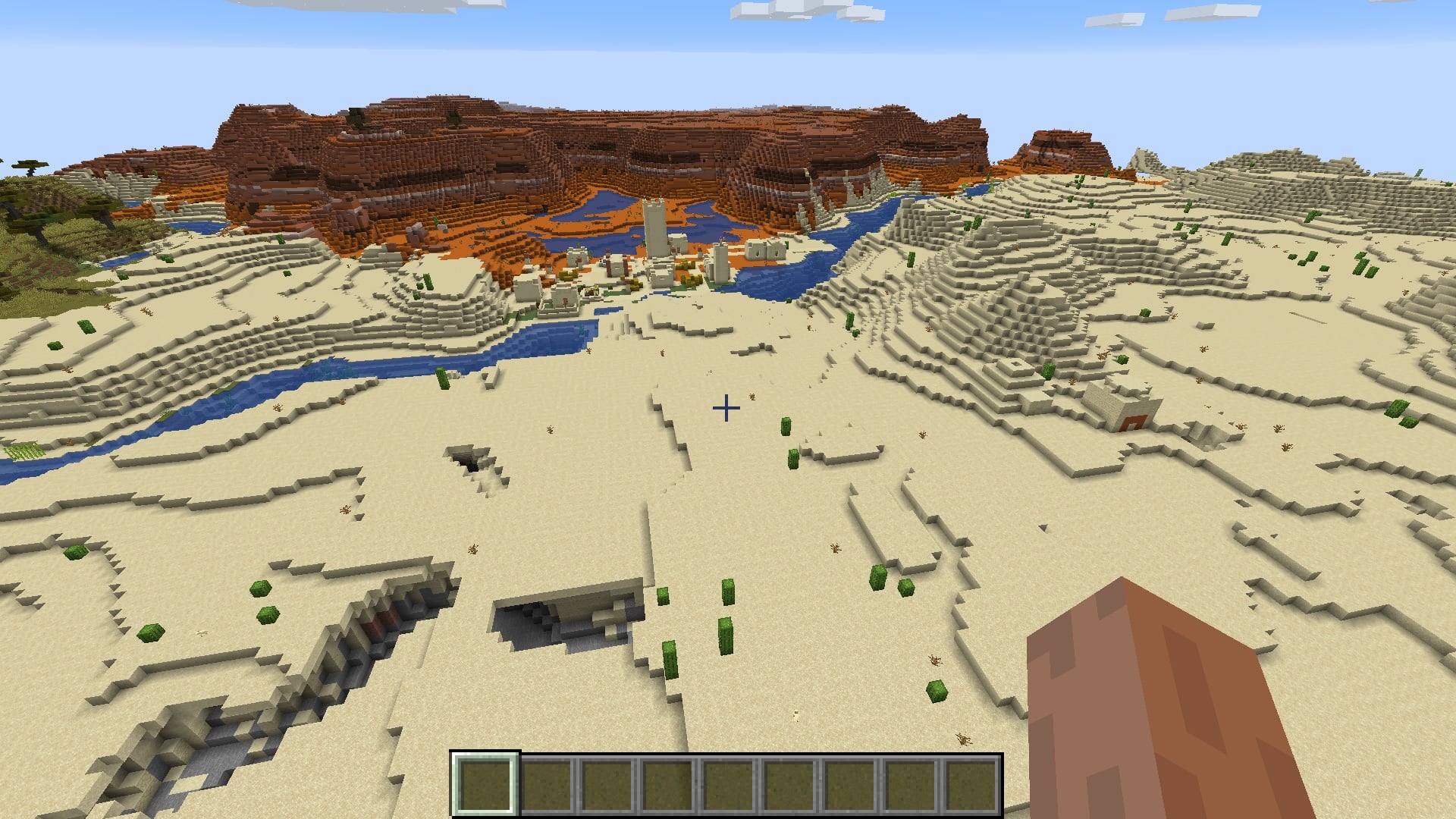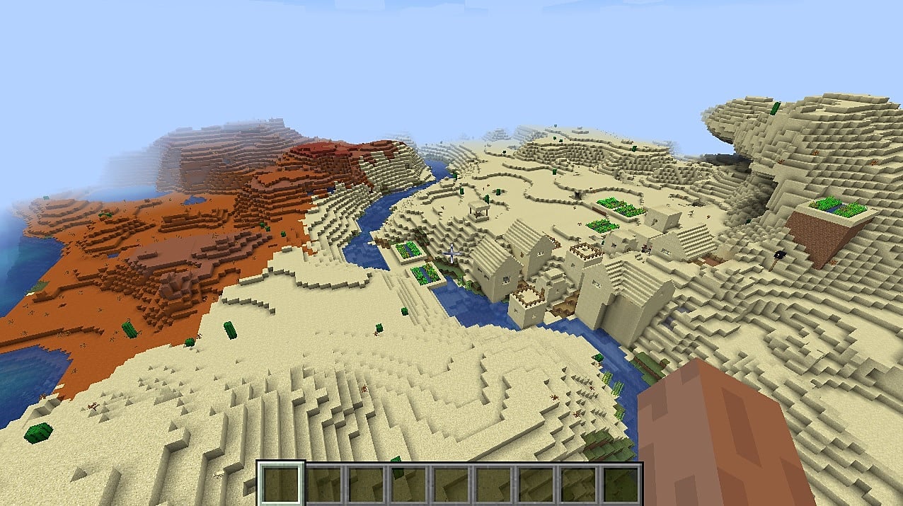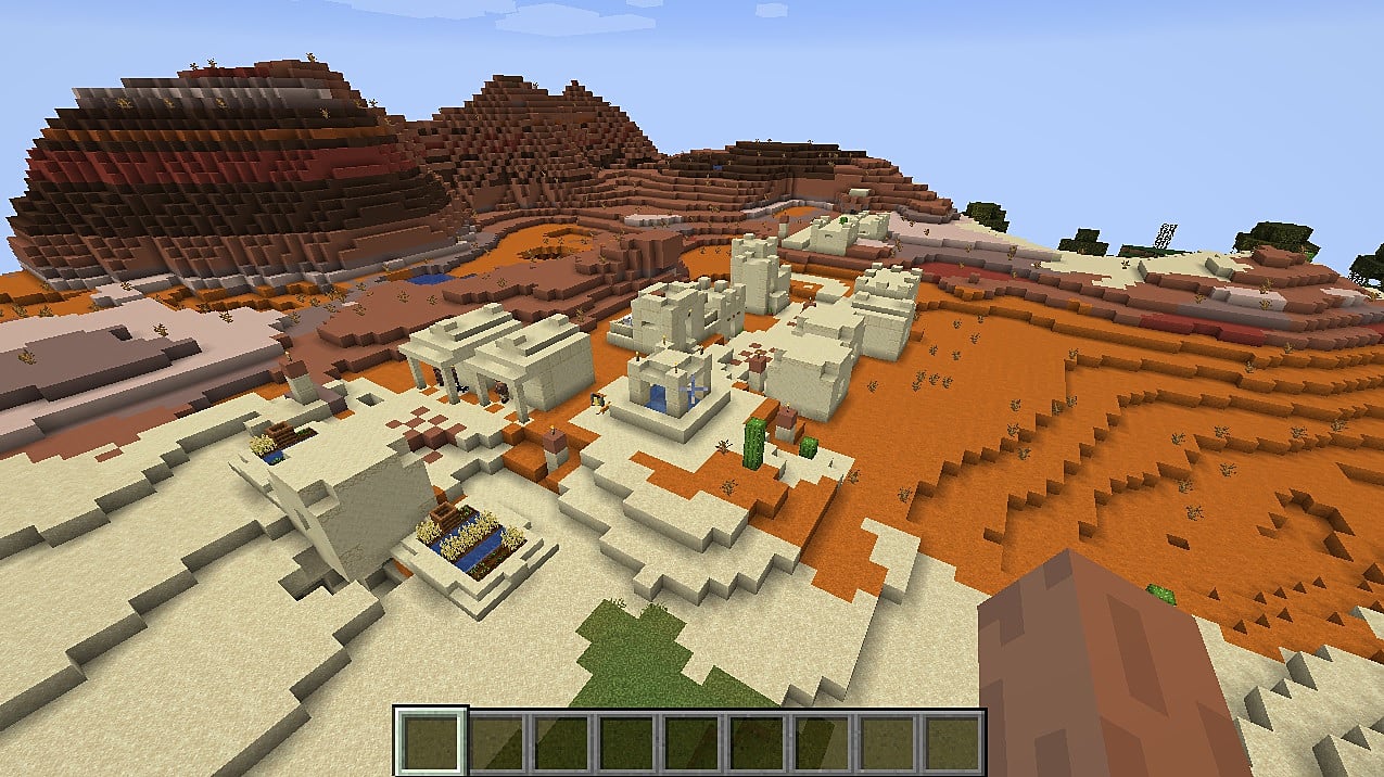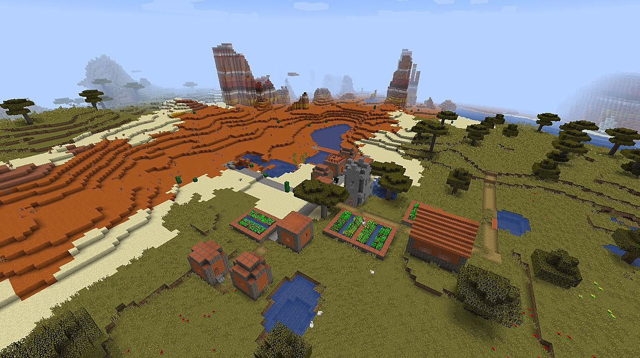 Here, you will spawn in the center of a plains village that stands near a mesa biome.