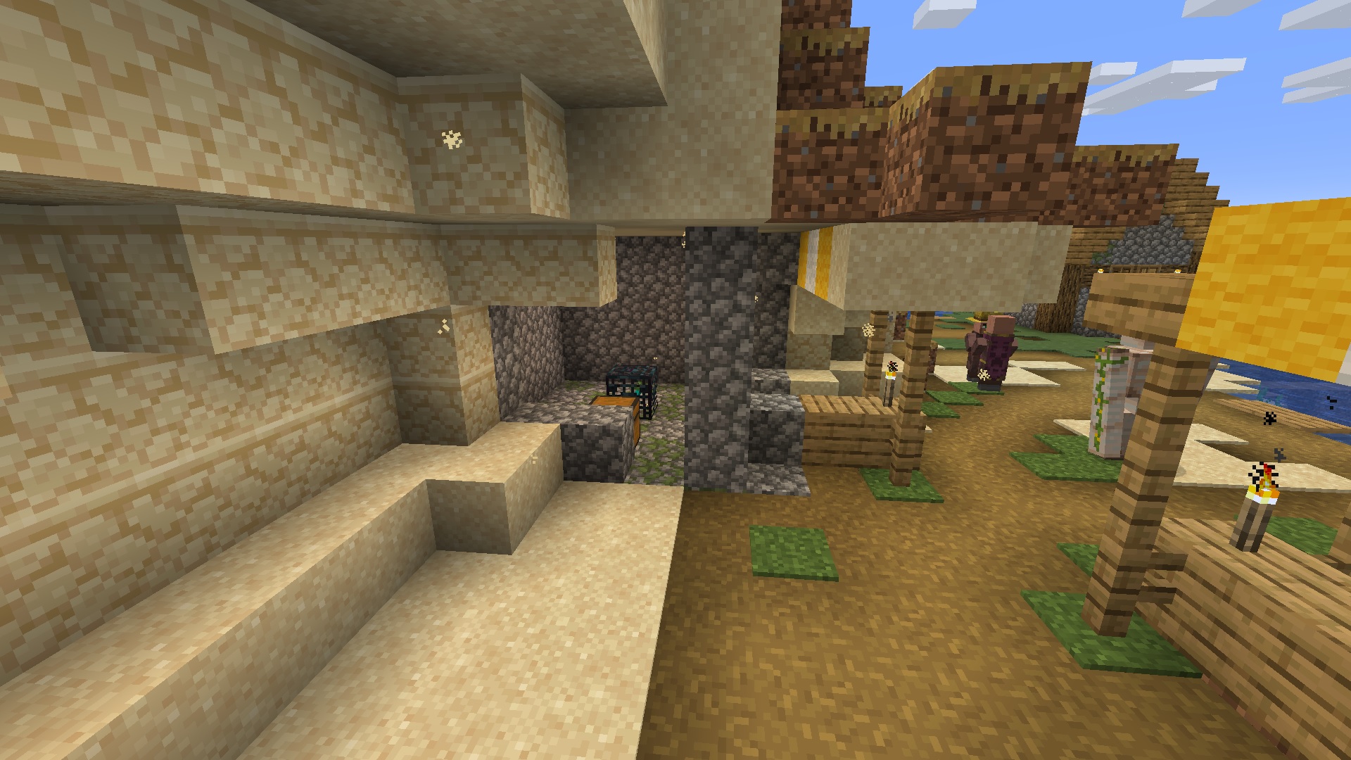 Here, you will spawn on an ocean shore near a village. To the north, you will see two small islands surrounded by icebergs. One island has a savanna village at coordinates -250, -750, and the other one has a desert temple at coordinates -500, -400.