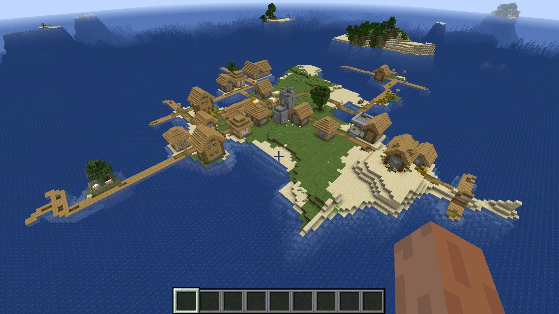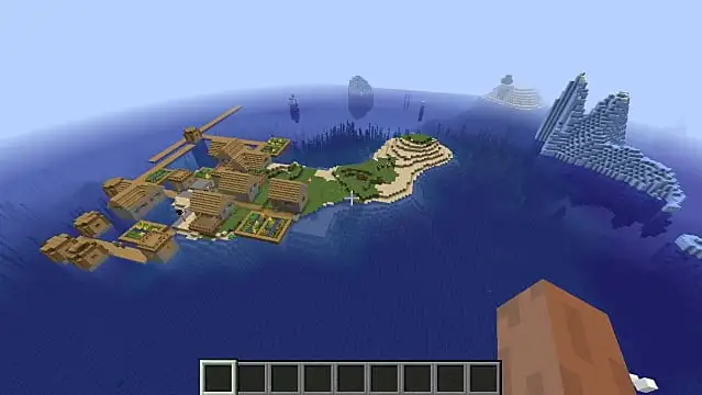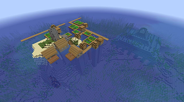 Here, you will spawn on a small island with an ocean monument nearby. It is surrounded by a coral reef. Go south to coordinates -400, 1350 for an island village that practically stands on water without any support.