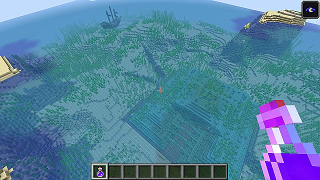 In this seed, you will spawn on a survival island that is surrounded by icebergs. Between the two icebergs, you will see an ocean monument and a few shipwrecks lying around.