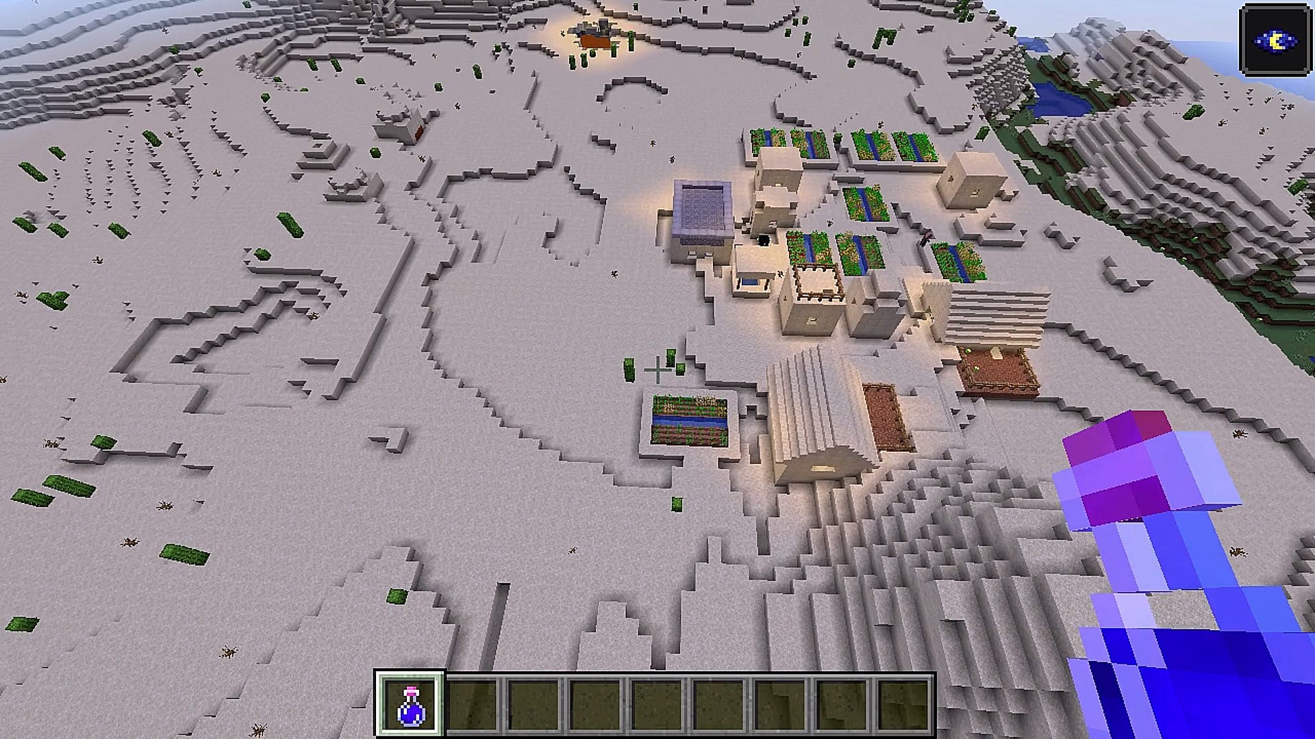 In this seed, you will spawn right next to a super rare structure, when two different buildings meld into one. In this case, it's a desert temple and a pillager post mashed together.