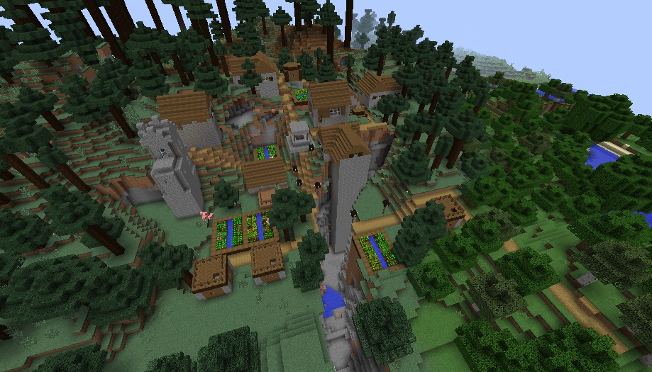 Spawn in the middle of the forest with a pretty big village that has one of its buildings based in the ravine. It’s quite an unusual sight and you don’t see this kind of structure generation too often.
