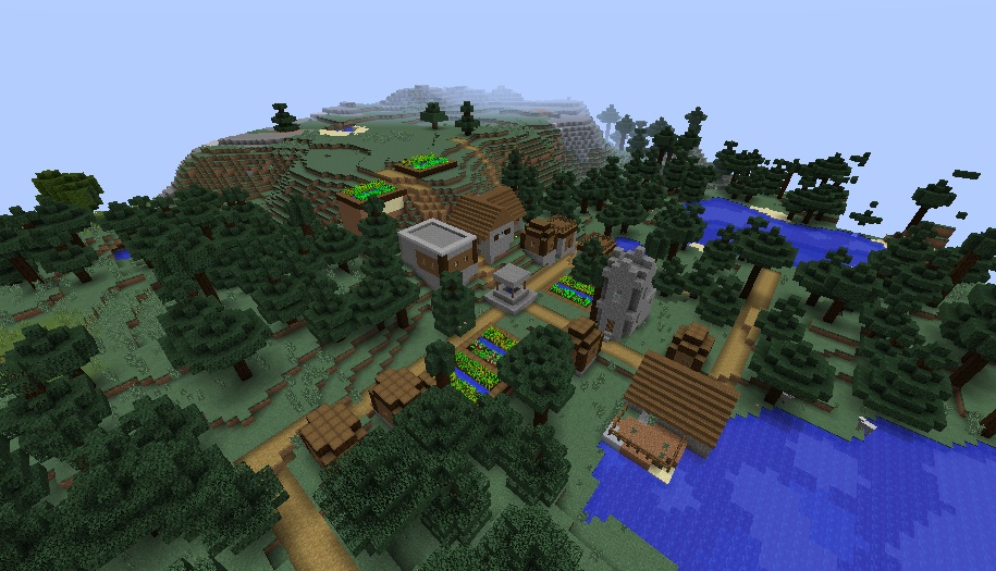 Spawn on a small patch of land surrounded by water that accommodates a neat village with a blacksmith that literally stands on a bottomless pit, so be careful. The chest inside contains the following: