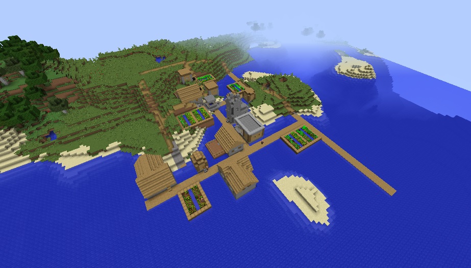 Spawn in the middle of wild taiga that has nothing to offer for thousands of blocks, but at 1920 63 -157 you will find a village that stand in the surface of the river.