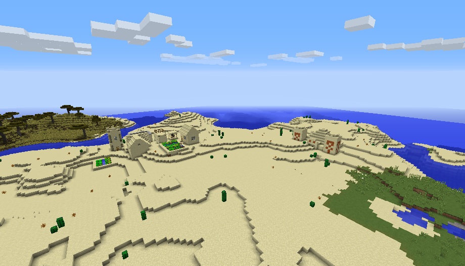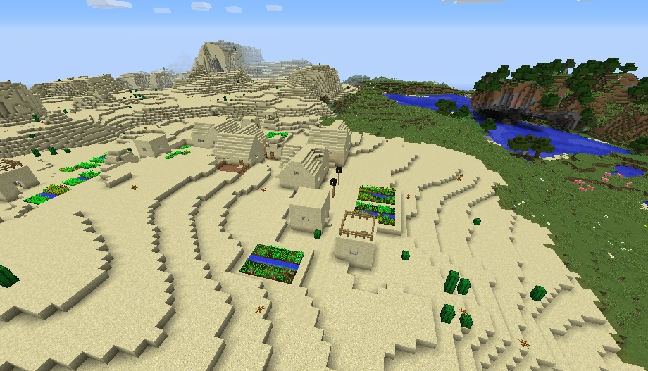 Spawn right next to a desert village and a temple. The settlement consists of ten houses, a library and farms with wheat, potatoes and carrots. The chests in the temple nearby are some of the best in the game and include diamonds, emeralds, gold ingots and a horse saddle. If you dig right under the temple, you will find yourself in an abandoned mineshaft with some more diamonds.