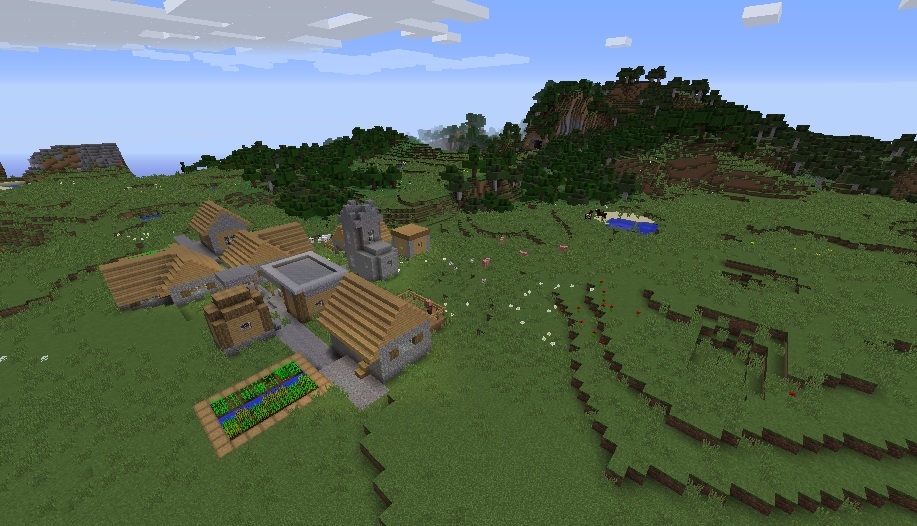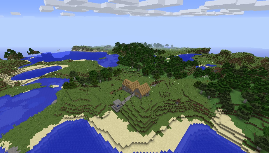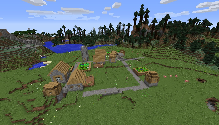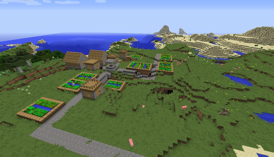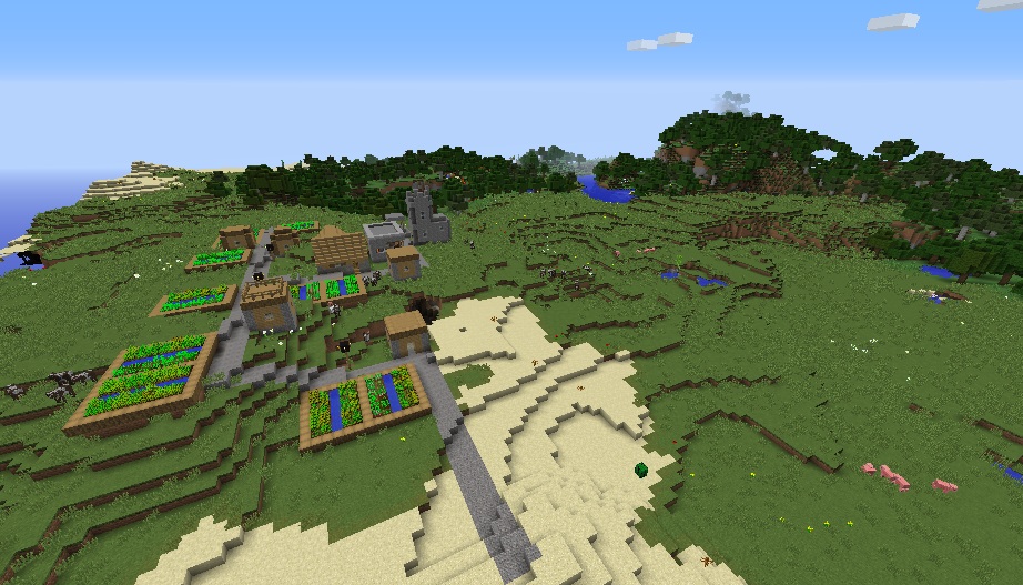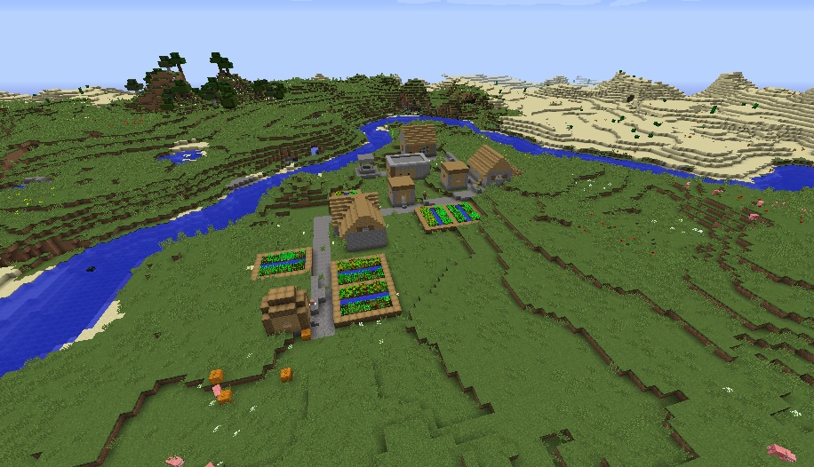 Spawn close to a huge naturally generated village in the plains biome. Unfortunately, there is no blacksmith or church, but you will find a lot of farms with potatoes and wheat, and two libraries. The location is surrounded by a few other biomes, such as extreme hills, taiga, forest and jungle.