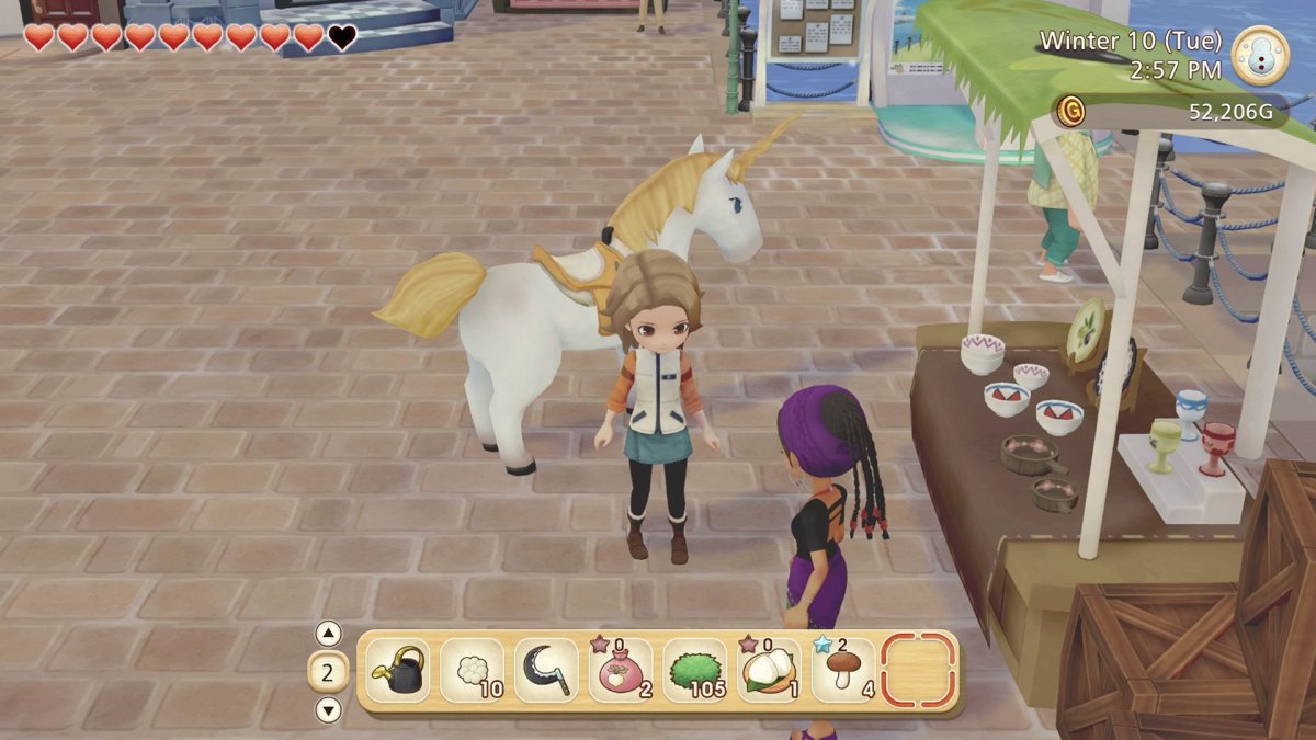 It wouldn’t be a Story of Seasons game without horsepower, and Pioneers of Olive Town had new ways of getting around. In addition to the trusty horse, players can tame different mounts, including wolves(!), or even ride a motorcycle or unicorn around town because of course, they can.