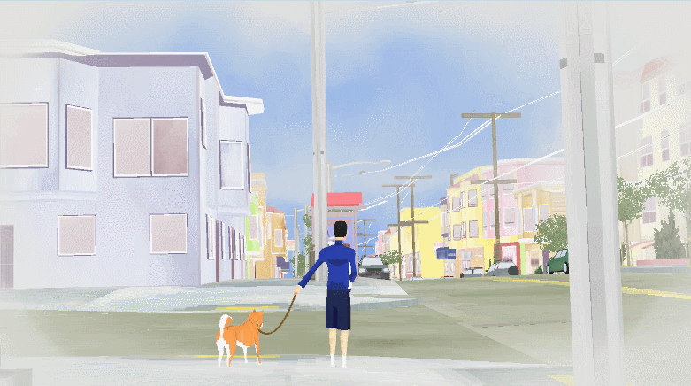 Keane Ng: The project is semi-autobiographical. I do actually have a Shiba (his name is Kiba) and I live in the neighborhood most of the game is set in. The places you’ll see in the game are places I go to with my dog, so a lot of the game is pulled directly from my experience as a dog owner. Many parts of the narrative are fictionalized to add drama and structure to the game, but most of it has some foundation in real life. The game is sort of a my way of making a memoir about having a dog, but also a love letter to San Francisco, where I grew up and have lived most of my life.
