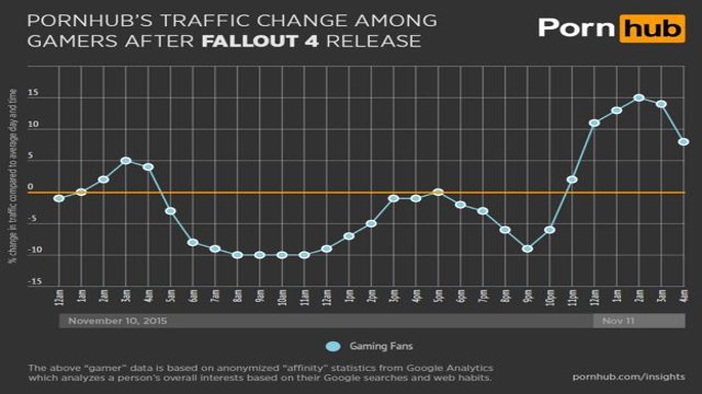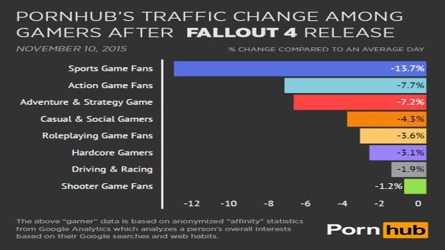 Apparently this was the case upon Fallout 4’s release, as the popular adult entertainment site, Pornhub recently reported that Bethesda’s latest post-apocalyptic wasteland romp (pun intended) caused the site to lose a pretty significant amount of web traffic.
