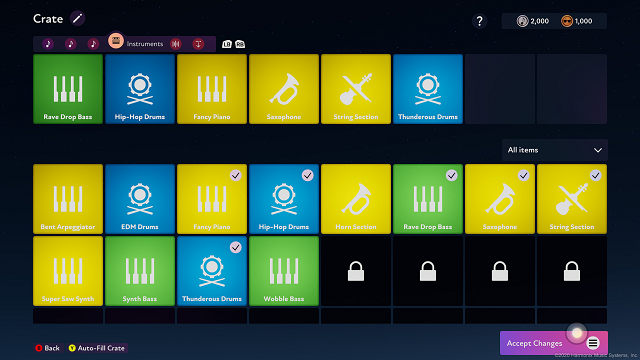 Speaking of instruments, not only does the game feature hundreds of songs, each with multiple tracks that allow for millions of possible permutations, but it also features a wide variety of instruments, each with dozens of loops that you can switch between at any time, essentially composing your own instrument track.