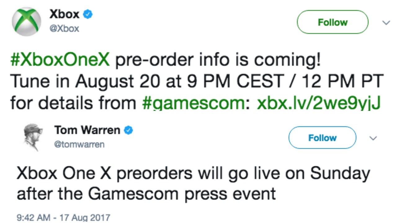 Earlier this week, Tom Warren of The Verge reported that Xbox One X preorders would go live today after Microsoft’s Gamescom press conference. Although Microsoft has not confirmed the date that preorders will go live, the Xbox Twitter account did reveal that preorder information would be included in the press conference.
