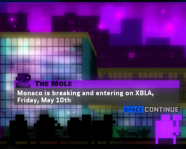 Unfortunately just a short time before their expected launch, the developers discovered an issue with their Xbox Live Co-Op gameplay, a pretty critical piece of the game. They decided on the lesser of two evils, and quickly postponed the release date, indefinitely. Despite the frustration of having to wait for the IGF 2010 winning title even longer, fans were appeared grateful for the level of communication from Monaco’s development team, and they took it in stride voicing their continued dedication and excitement.