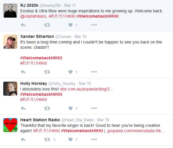 Fans have shown their excitement by trending the hashtags #おかえりHIKKI or #WelcomebackHIKKI. As fans buy her new songs, it will help support a charity event named the New-Turn project. Money raised as a part of this project will go towards planting cherry blossom trees in areas affected by the 2011 Tohaku earthquake and tsunami.