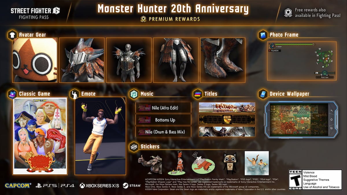 This anniversary event takes place in Street Fighter 6 from April 1 to the end of the month on April 22. You can check out all the collaborating Monster Hunter themes during that time. There’s a lot to discover, from weapons and armor to stickers and emotes. They’ll even have the Battle Hub decked out in Monster Hunter decor and background music.