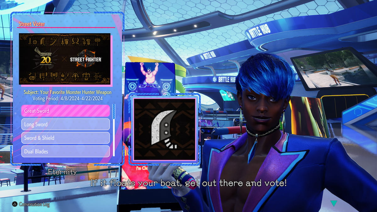 If you need some extra Drive Tickets to purchase these exclusive goodies, stop by Eternity in the Battle Hub. Starting April 8, vote for your favorite Monster Hunter weapon to earn up to 2,000 Drive Tickets.