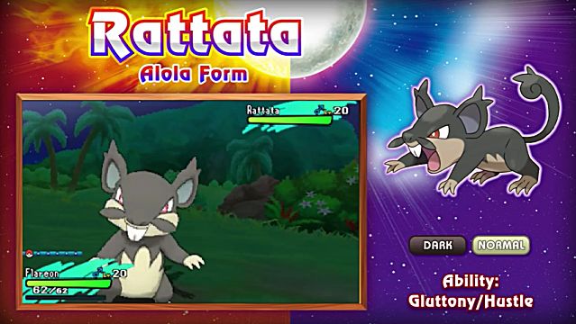 That’s right, Rattata is getting an Alolan form – which I totally predicted down to the lore by the way! Its typing is Dark and Normal, and its abilities are Gluttony (which causes it to eat held items early), and Hustle (which trades 20 points of accuracy for 50% extra attack stat).
