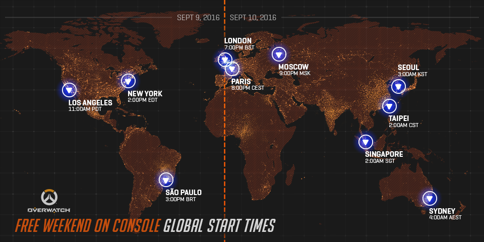 Blizzard Entertainment has announced that Overwatch will be free to play for PS4 and Xbox One users during the second weekend of September — sorry PC gamers, the free weekend is exclusive to consoles. The Overwatch Free Weekend will start on September 9 at 11 am PT and end on September 12 at 4 pm PT. You can find your regions start time in the reference guide below.
