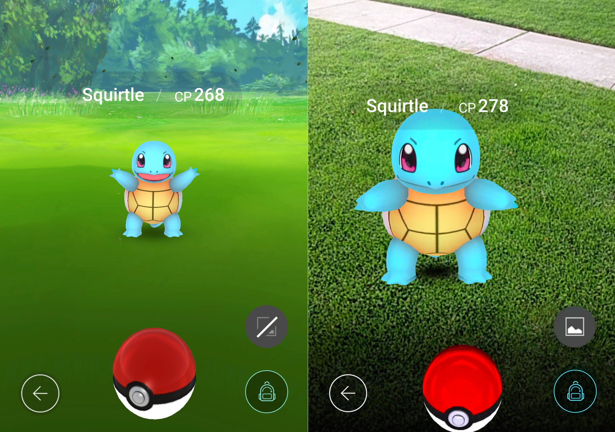 For players put off by the animation quality of Augmented Reality games (right), you can use a pre-rendered background that resembles those of the 3DS Pokémon games instead (left).