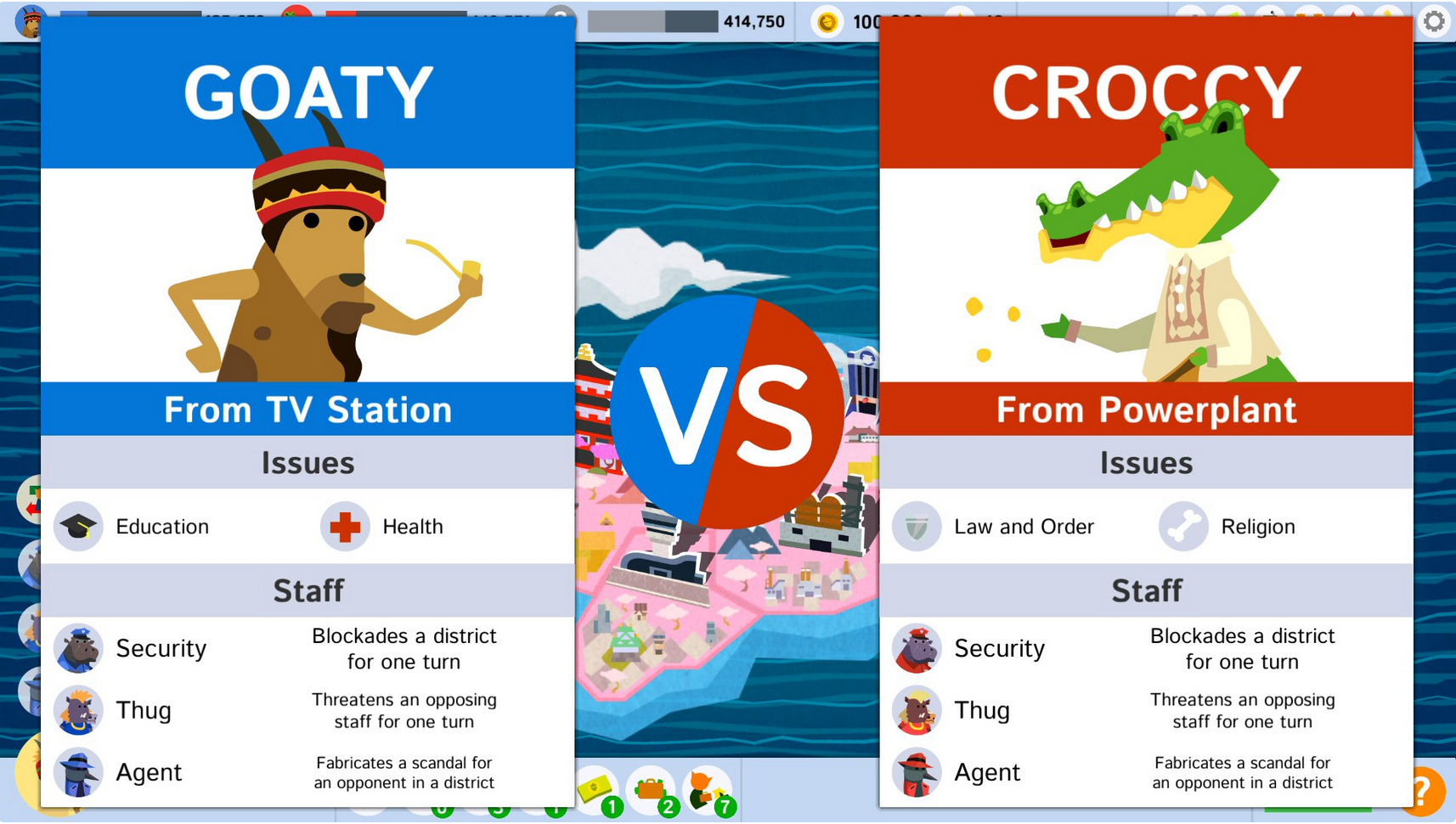 For each turn the player assigns tasks to their animal-candidate and election staff. These tasks can range from moving districts, raising money, holding a rally or committing different acts of bribery or corruption.