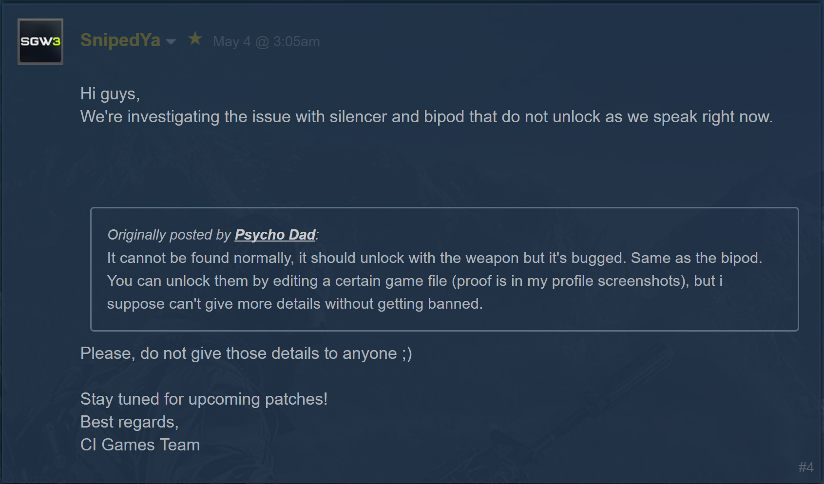 In the Sniper: Ghost Warrior 3 Steam forums, a player by the moniker Psycho Dad said he found a file that when edited, gave him the attachments in question. SnipedYa, a private account apparently run by CI Games, asked him not to share how he did it, as they are already on it: