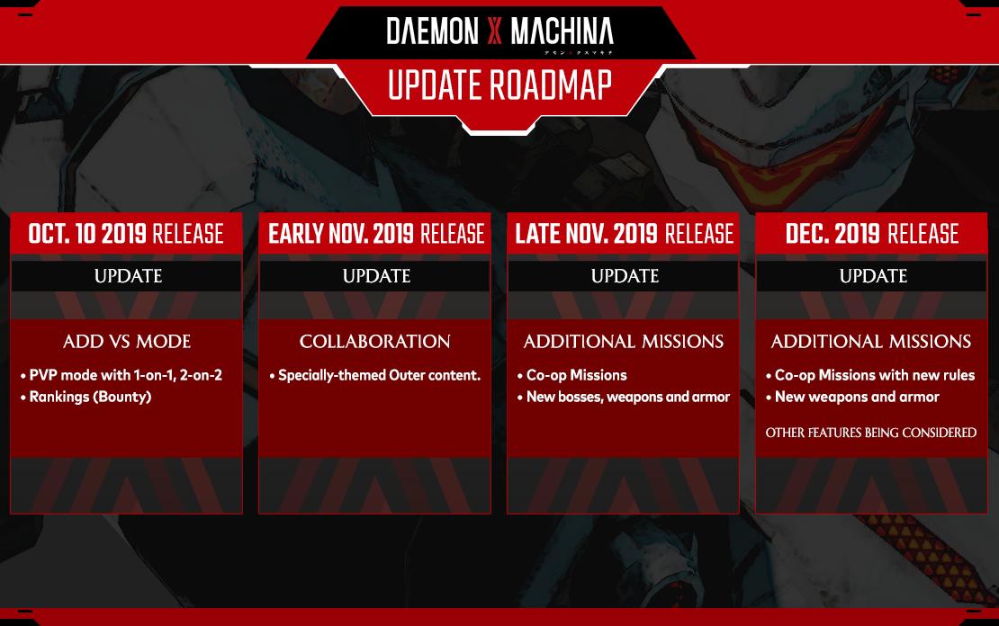 Last on the content map is December, which brings with it gifts of new co-op missions and yet more armor and weapons. This might not be the last we see of new Daemon X Machina content either since the map says “Other features are being considered.”