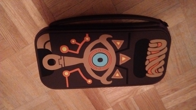 The reverse side is similarly well finished. It has a matte coating that can’t really be done justice in images, since the white balance changed the color from a much deeper brown to…whatever this orange mess is. The exterior of the case also features a carrying grip, as well as a metallic black zipper with the same Sheikah Eye pattern seen above.